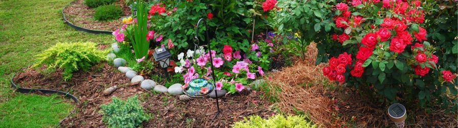 Ilustrační foto. Betonové a plastové obrubníky kolem zamulčovaného záhonu.